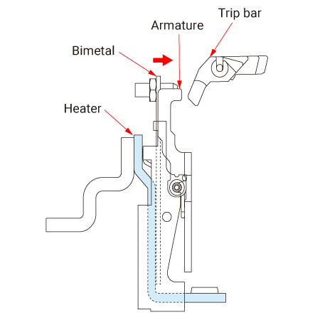 When overcurrent flows, the bimetal becomes overheated, bending in the direction shown by the arrow and moving the trip bar.
