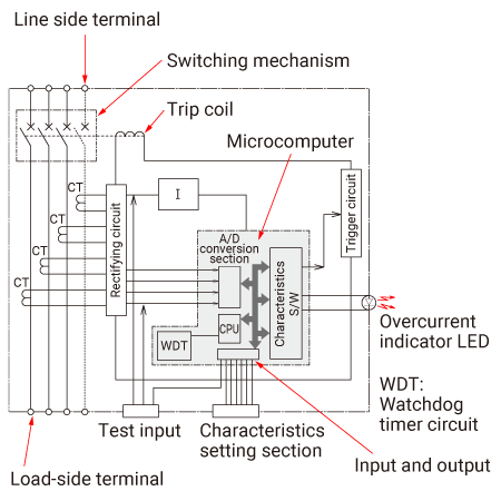 2️⃣  When overcurrent or large current flows, the timing circuits operate according to the maximum current, and the trigger circuit outputs the trigger signal. This excites the trip coil and activates the open/close mechanism.