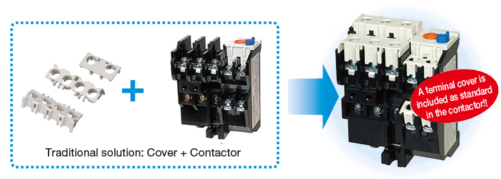 In addition to the Magnetic Contactor, a terminal cover has been provided as a standard for the thermal, magnetic relay and auxiliary contact unit options. This realizes a finger protection function that complies with the DIN and VDE Standards, prevents electric shocks, and increases safety during maintenance and inspections.